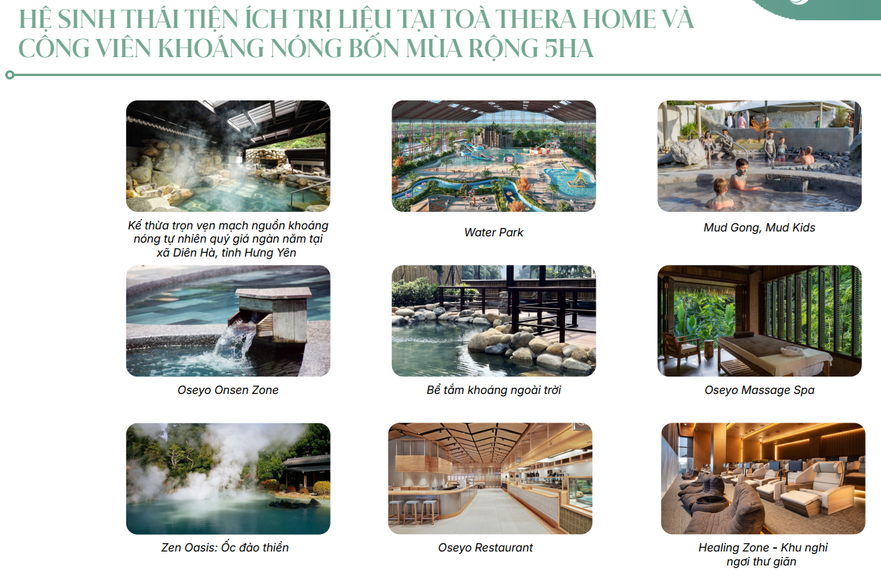 - Khu tắm Onsen khoáng nóng ngoài trời, Khu tắm Onsen khoáng nóng trong nhà, Khu xông hơi, Khu tắm bùn, Đấu trường bùn, Khu bùn trẻ em, Công viên nước, Bể bơi khoáng, Ủ cát Enzym, Tắm thuỷ lực, Khu ngâm chân suối nóng, Phòng nghỉ ngơi – thư giãn, Thư viện, Khu vui chơi trẻ em, Khu ẩm thực – Food Court, Khu coffee – fastfood…