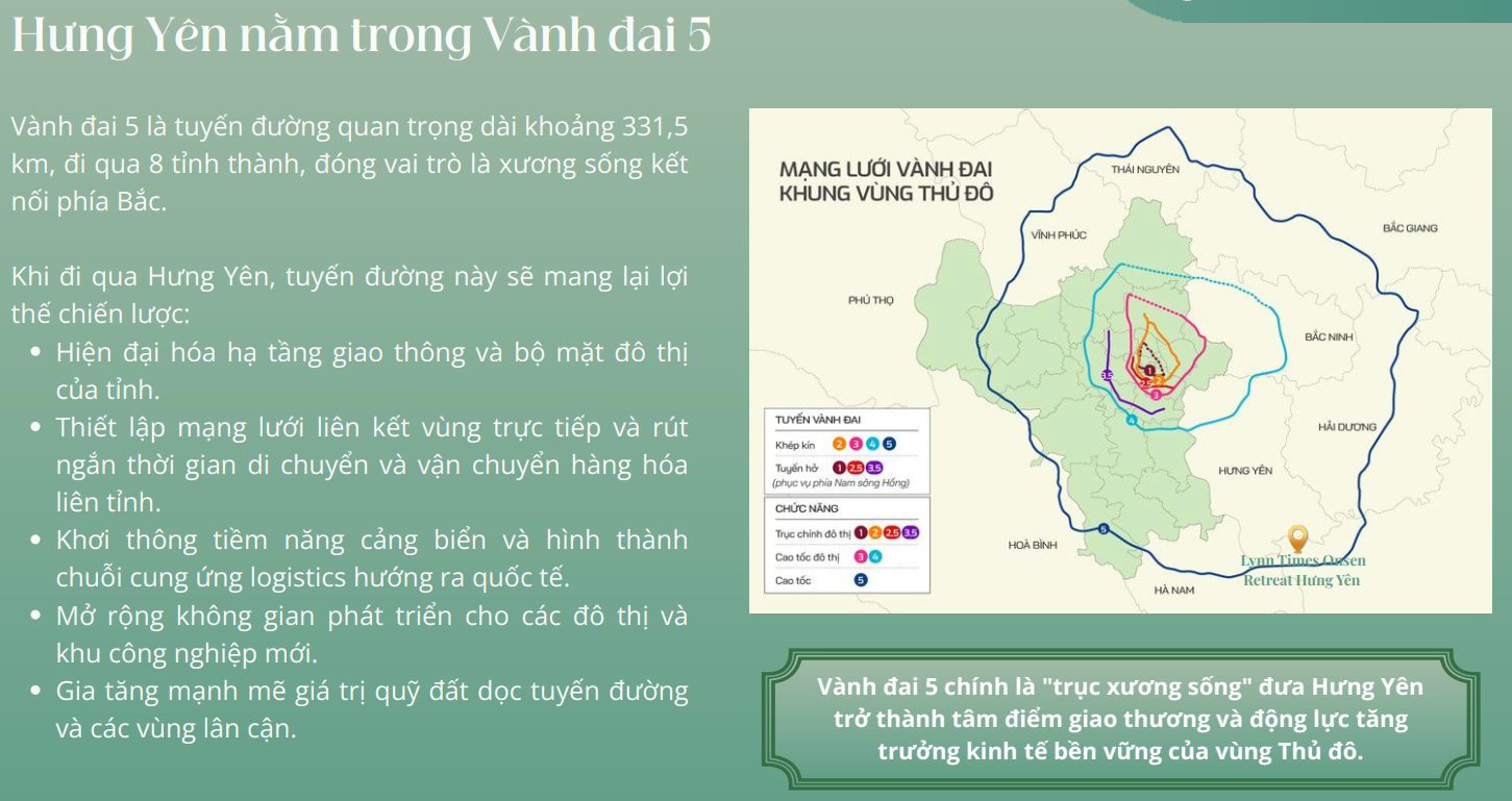 Vành đai 5 chính là “trục xương sống” đưa Hưng Yên trở thành tâm điểm giao thương và động lực tăng trưởng kinh tế bền vững của vùng Thủ đô. Vành đai 5 là tuyến đường quan trọng dài khoảng 331,5 km, đi qua 8 tỉnh thành, đóng vai trò là xương sống kết nối phía Bắc. Khi đi qua Hưng Yên, tuyến đường này sẽ mang lại lợi thế chiến lược: